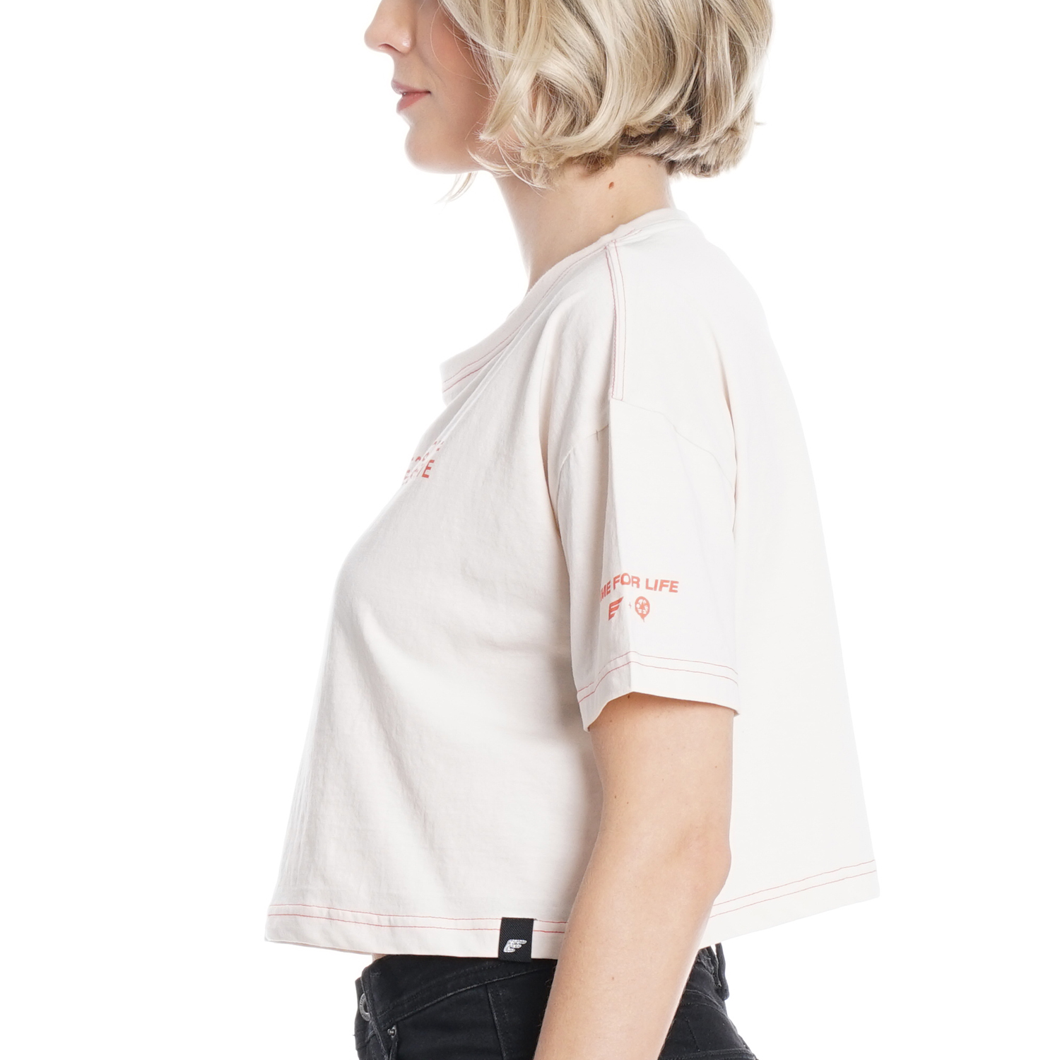 POLERA M/C SEMI CROPPED MANGA CAIDA TEXTO COSTURA COLOR